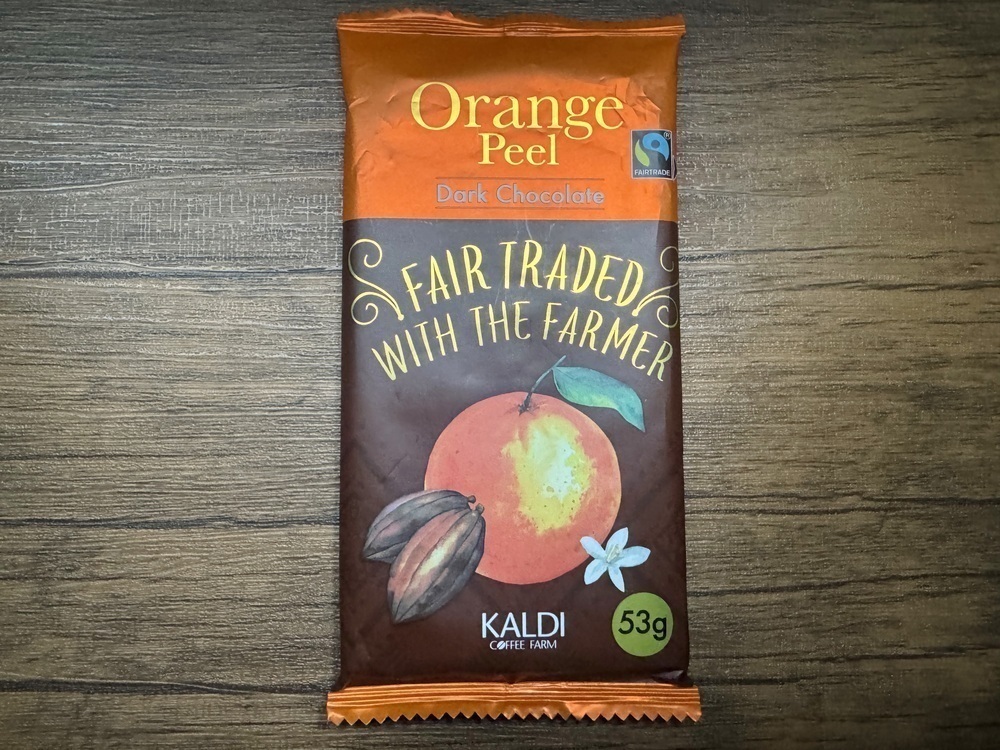 カルディのフェアトレードチョコレートシリーズから、華やかなオレンジのイラストが目を引く「オレンジピール」。