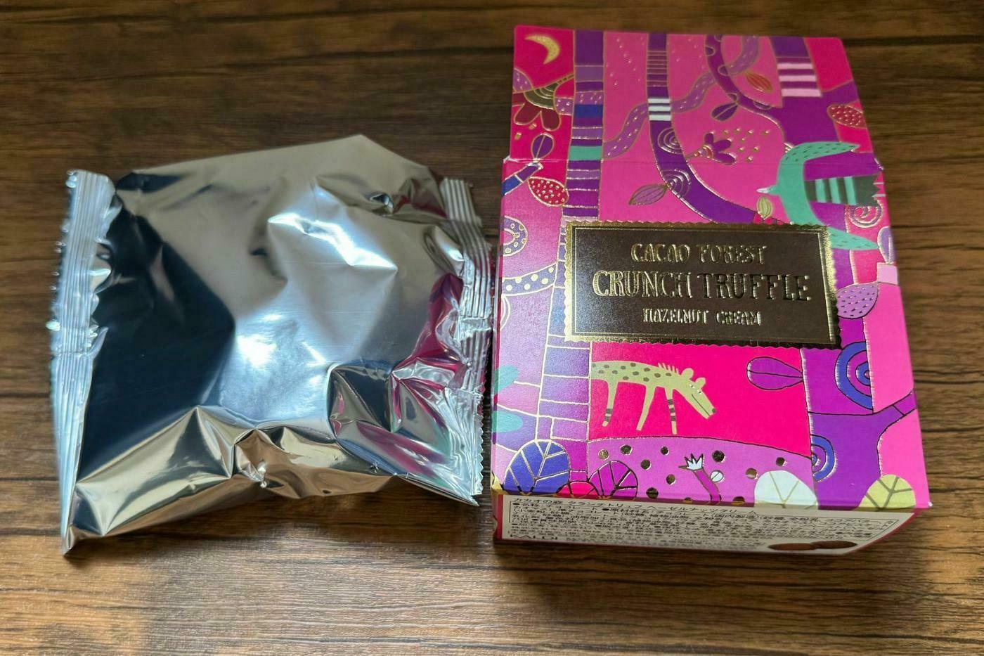 店頭でも一際目を引く、ピンクと紫の華やかなパッケージが特徴の「カカオの森 クランチトリュフ ヘーゼルナッツクリーム」です。
