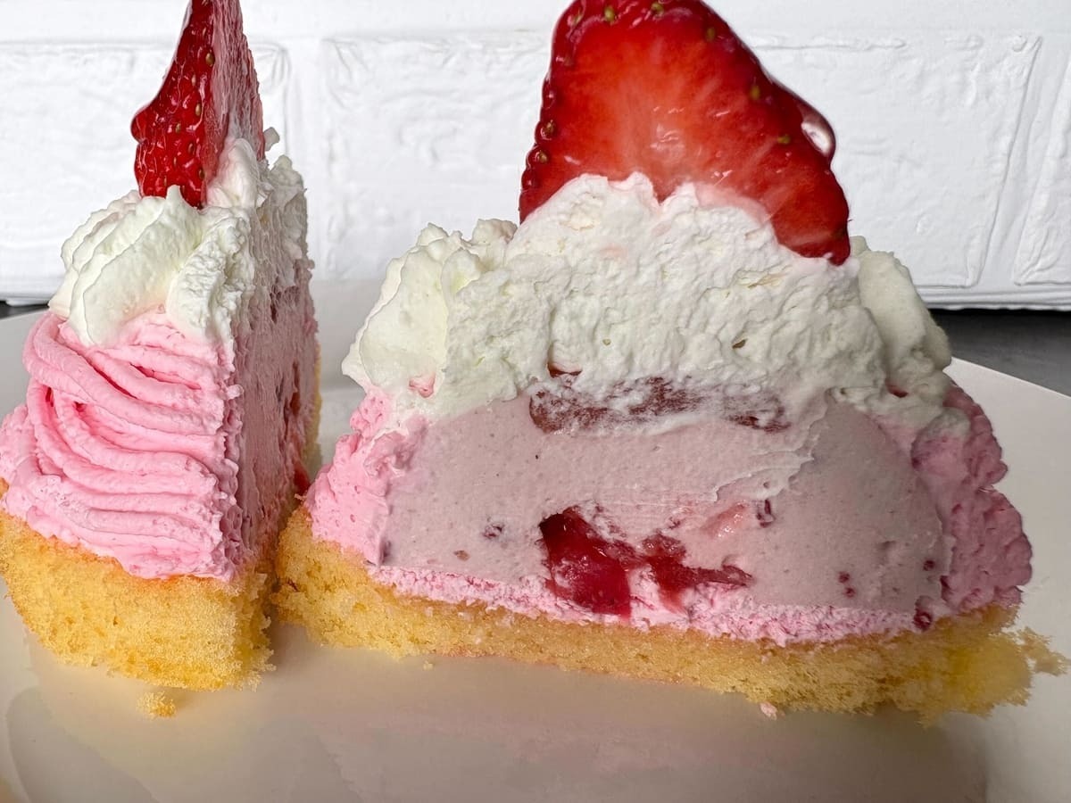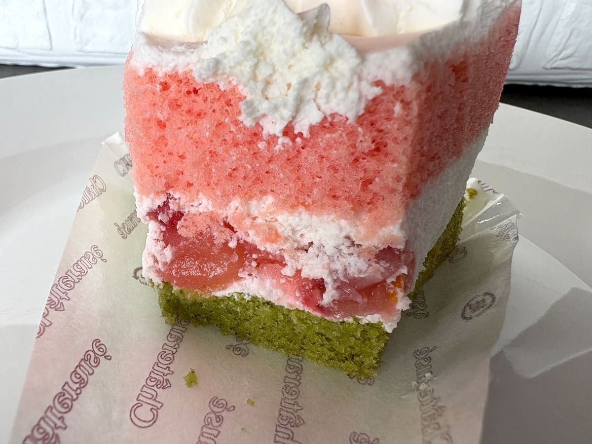 下から抹茶スポンジ、真っ白なホイップクリーム、そしてピンク色の苺スポンジと、美しい3層構造に仕上がっています!