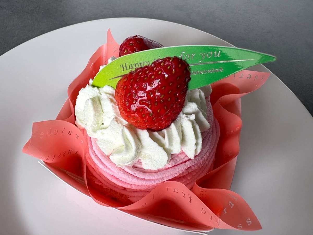 土台のスポンジには苺シロップが染み込み、やさしい甘さの桃ジュレ、そして苺クリームと真っ白なクリームがたっぷり重なっています。