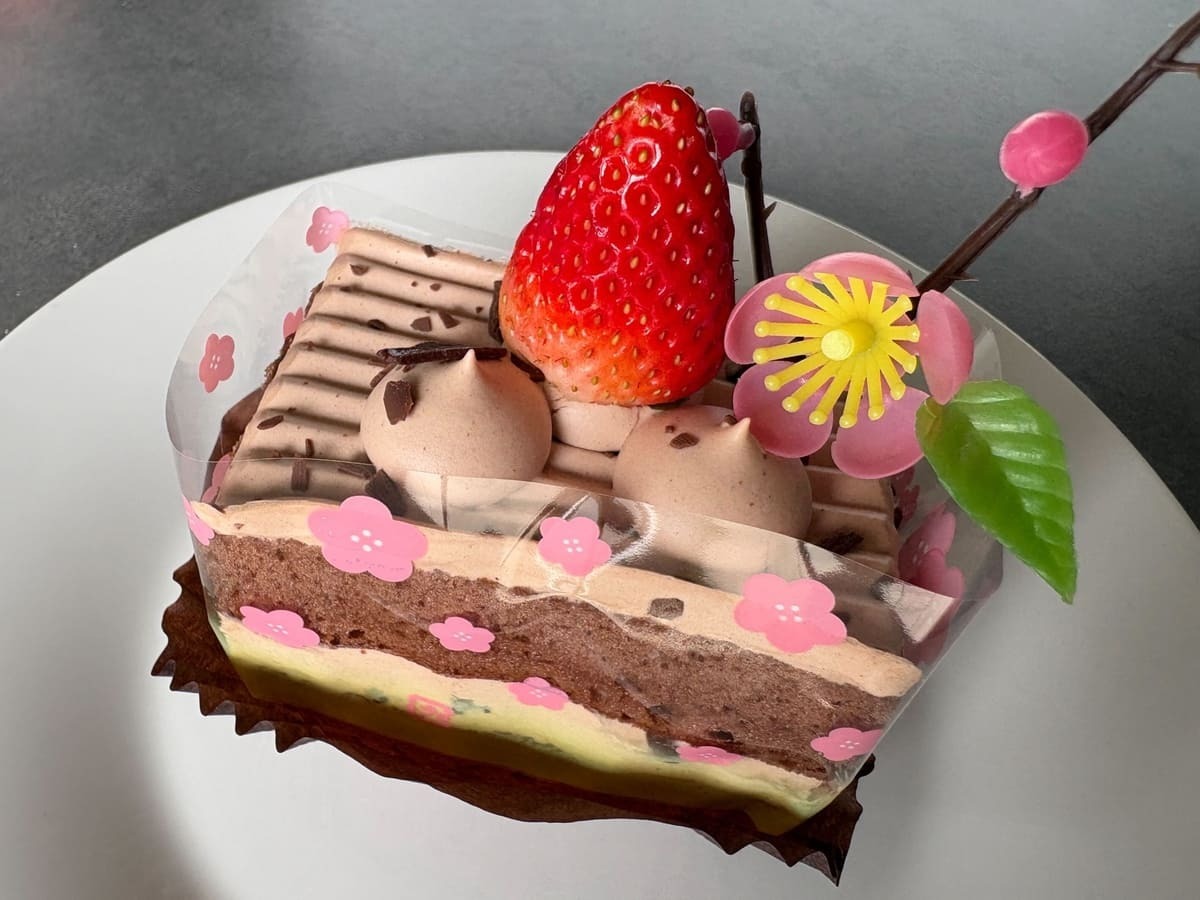トッピングには、フレッシュな苺と、ひな祭りにぴったりの可愛らしい桃の花があり、お祝いムード満点です!