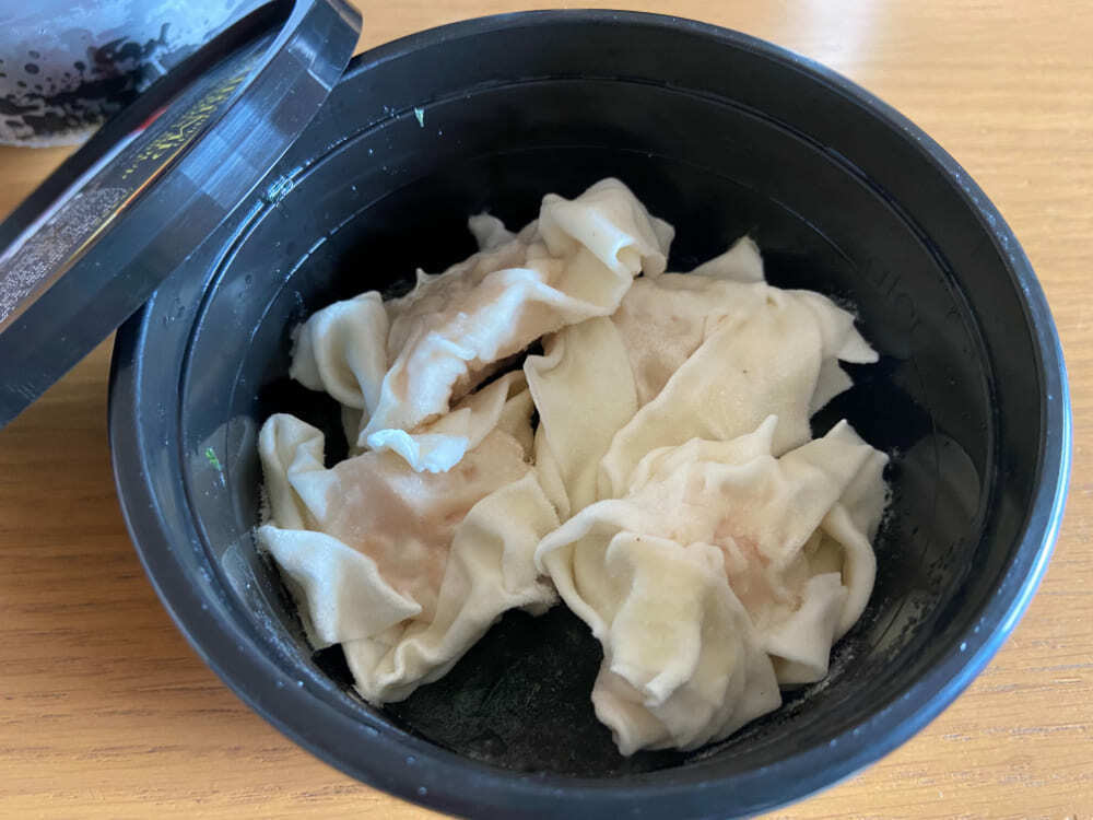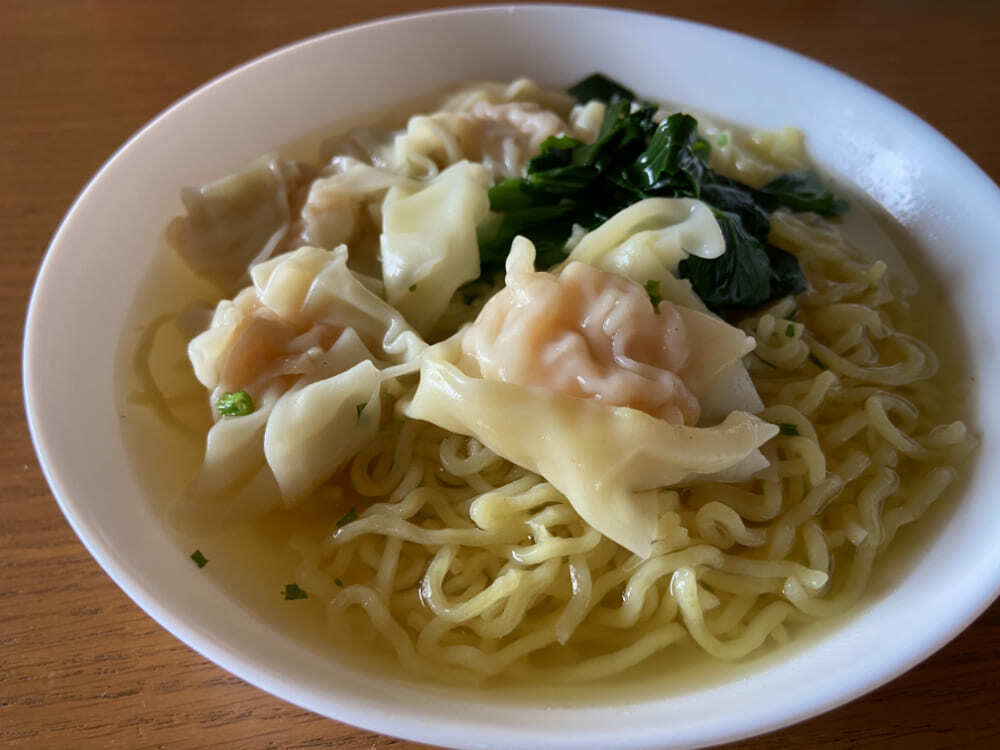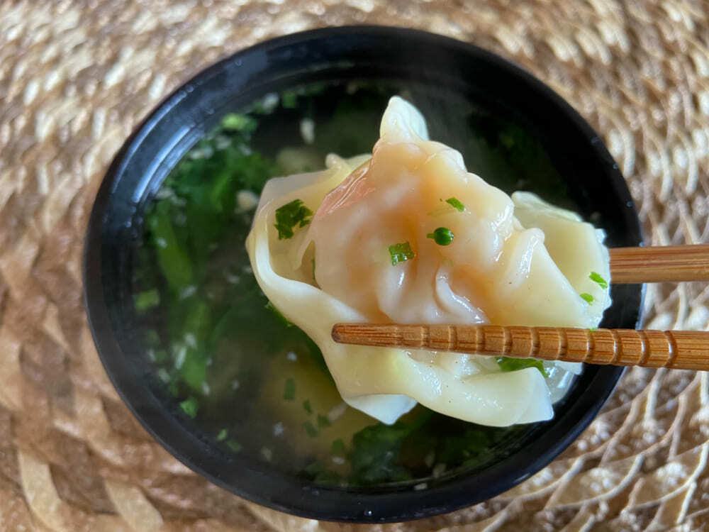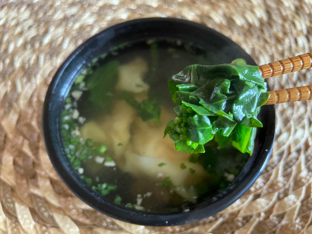 中には、大きな海老が丸ごと入ったワンタンが4個と、菜の花に似た「油菜」という野菜が入っています。ワンタンはつるんとした喉ごしで海老はぷりぷり、油菜は冷凍とは思えないシャキッと感があります。