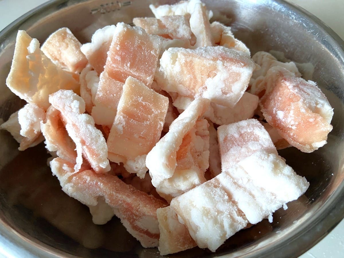 1.5kg入りの大容量パックで、一口大にカットされているので冷凍のまま調理可能。脂が多い部位なので、使う前にサッと熱湯で茹でると臭みも感じられません。
