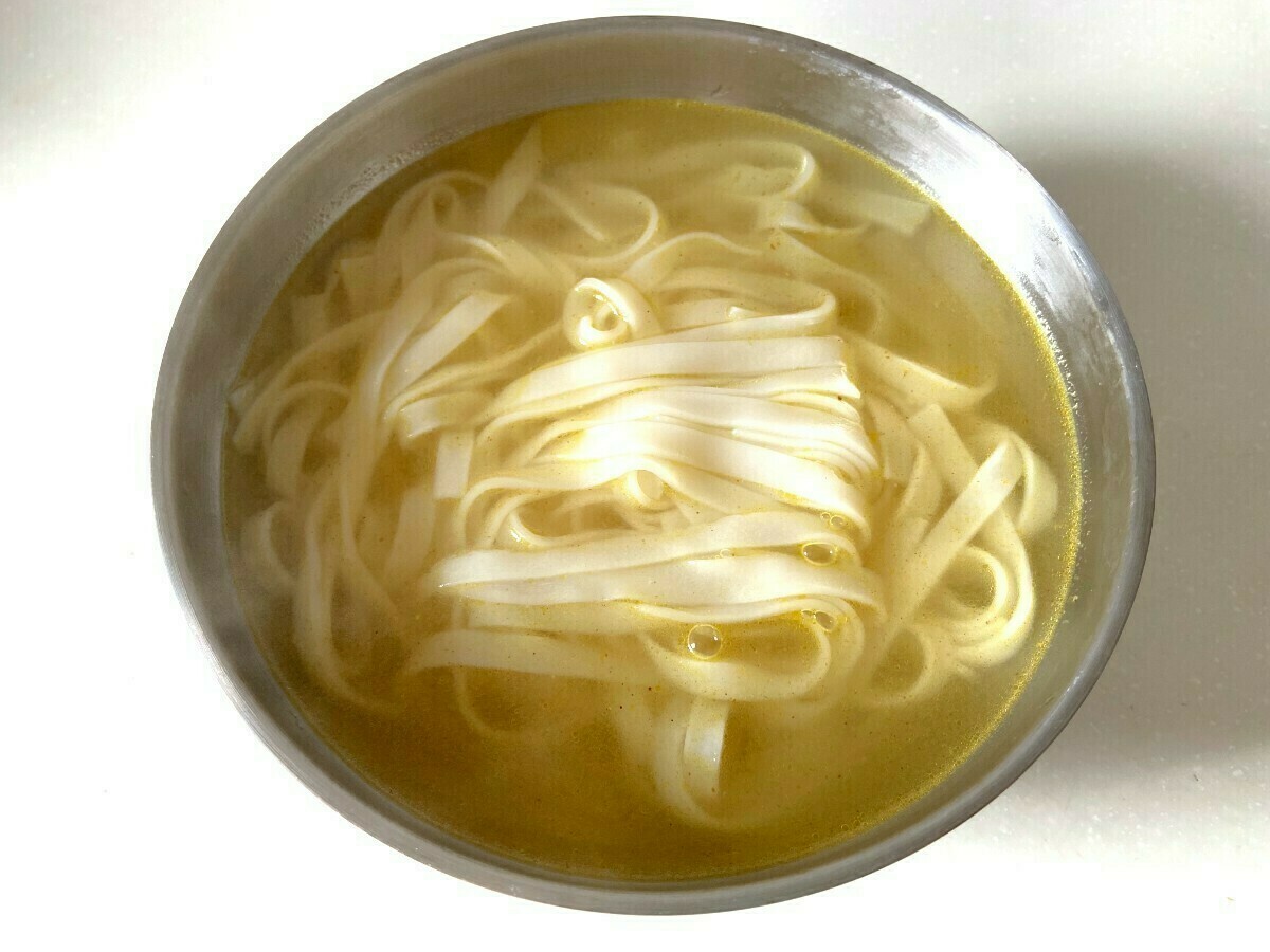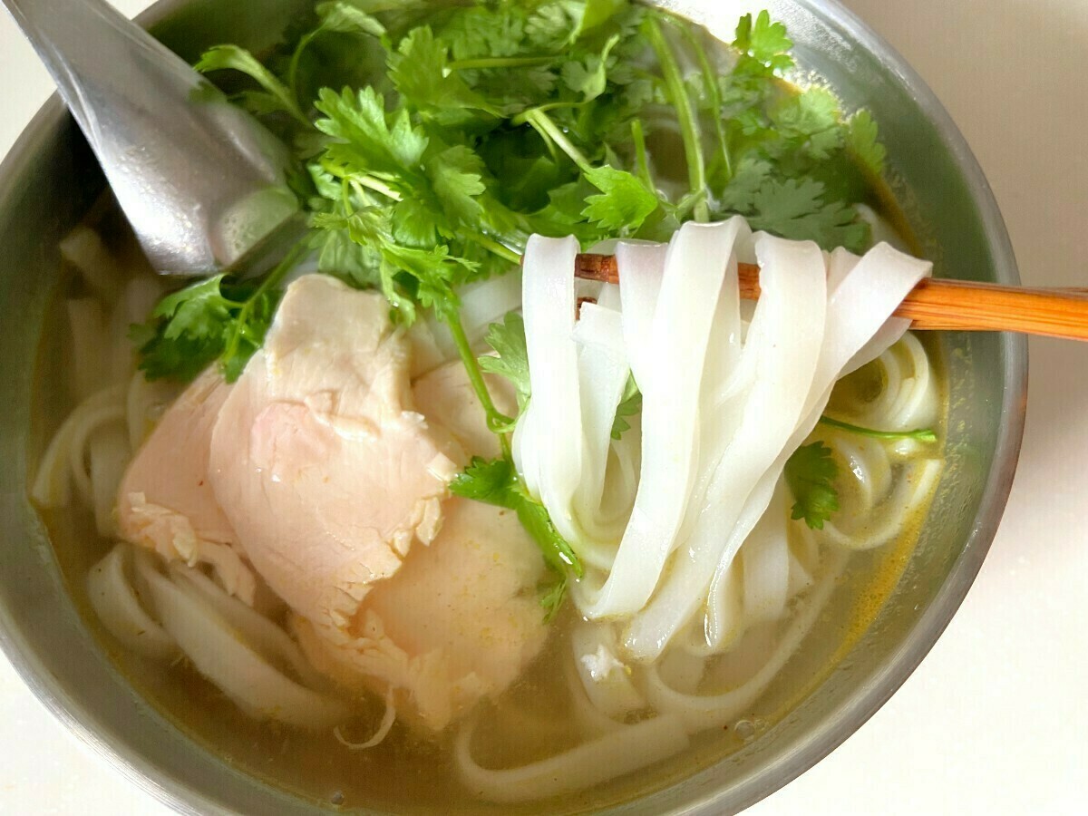 パクチーとチキンをのせると、ぐっと本場の雰囲気に近づきます。スープはあっさりとしつつも、まろやかな塩味と鶏の旨み、スパイスの香りが広がる本格的な味わいです。