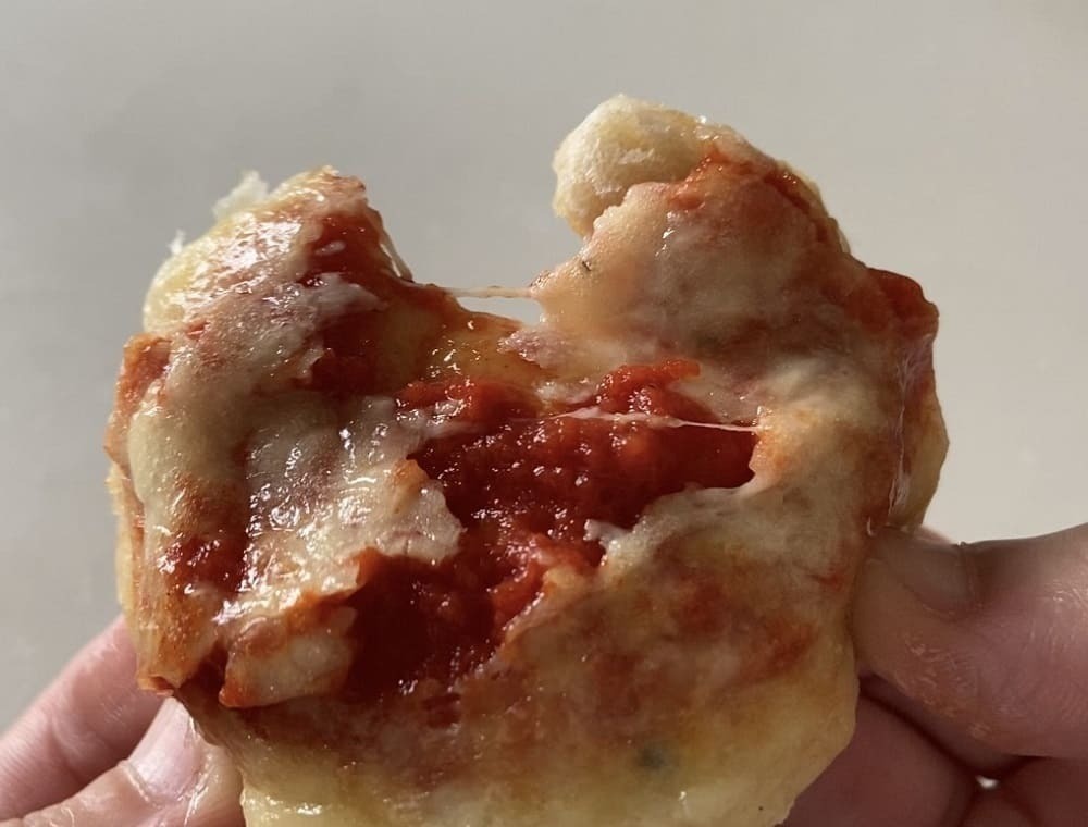 レンジ加熱で生地と表面のチーズが柔らかくなります(加熱直後は熱いためやけどに注意が必要です)。