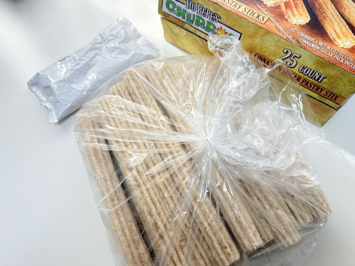 箱の中には、1つの袋にどっさりと25本のチュロスが入っており、シナモンシュガーは別袋で付属しています。