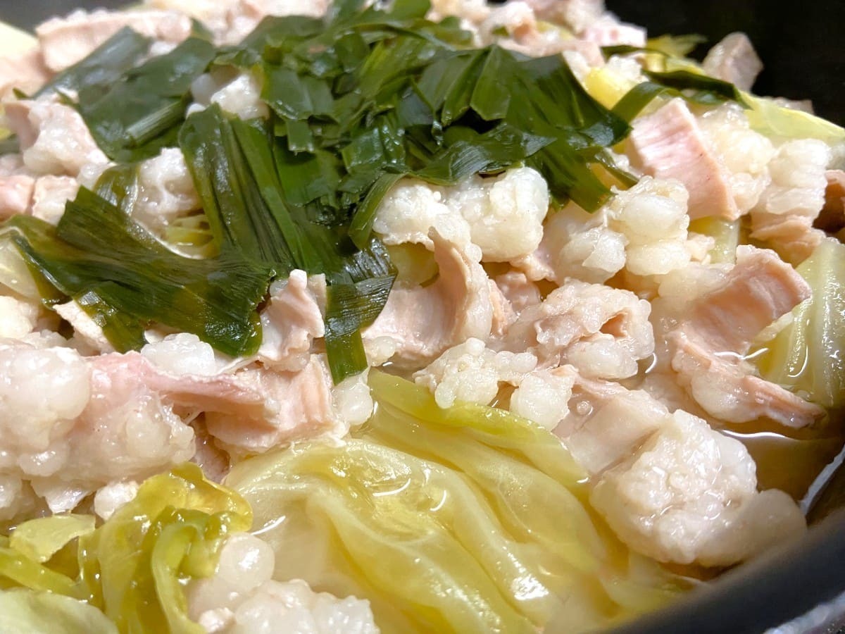 たっぷりのキャベツやニラと一緒に、シマチョウも豪快にのせて調味料を加えて煮込むだけで絶品もつ鍋の完成!
