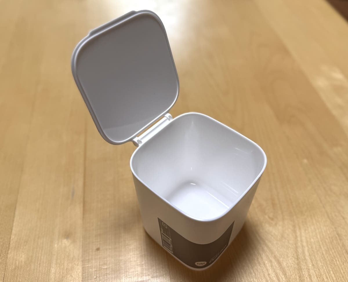 フタを開けたまま置いておけるので、筆者は編み物や縫い物中のちょっとしたゴミを捨てるのに重宝しています。