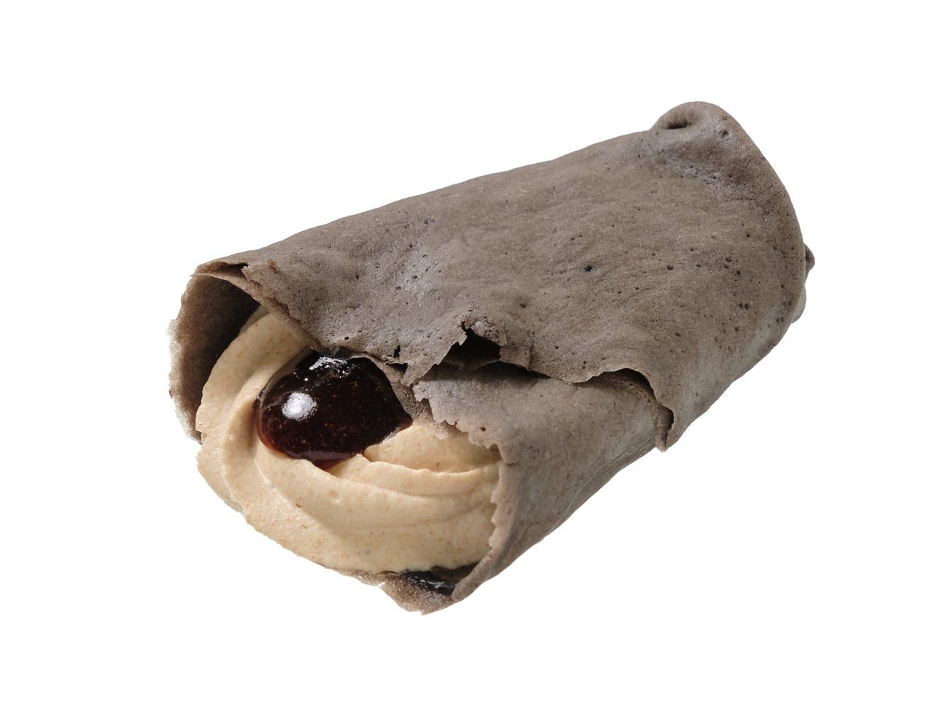 クレープ生地の中にきなこクリームを絞り、さらにお餅と、味のアクセントとなる黒蜜ソースを一緒に包み込んでおり、しっかりと「和」を感じられる仕上がりです。