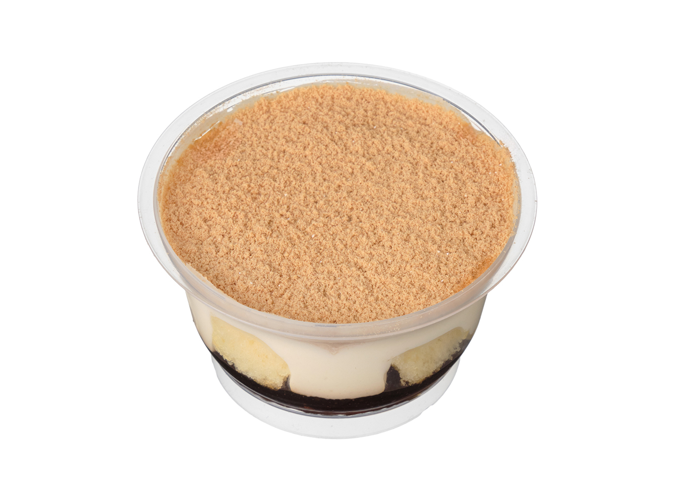 表面のきなこチョコレートをスプーンで割り、中に入っているティラミスムースや、底に隠れているとろけるおもち、黒蜜ソースと絡めて味わうティラミスです。