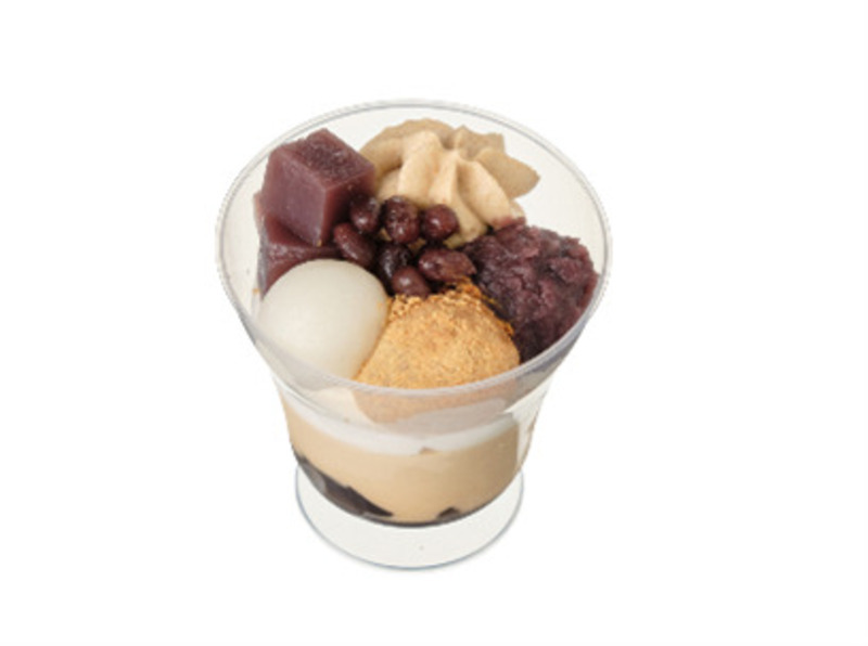 黒糖ゼリーの上に豆乳きなこムースとみるくムースを重ね、さらにその天面にきなこホイップ、粒あん、わらび餅、お団子、黒糖ゼリー、かのこ豆をトッピングした具だくさんの和パフェです。