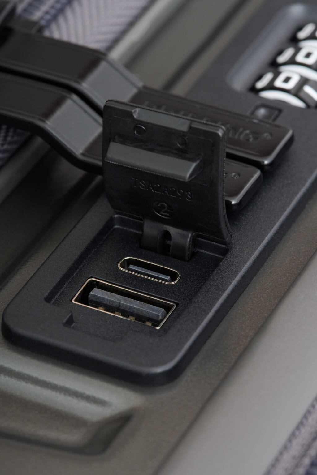 ほかにも、この新“SDシリーズ”は静粛性に優れる60㎜口径のホイールを採用して段差や毛足の長いカーペットでもスムーズに移動できたり、ロック部分にUSBポートを搭載してモバイルバッテリーとスマートに接続できるなど、トラベルシーンでの使い勝手を高めている。