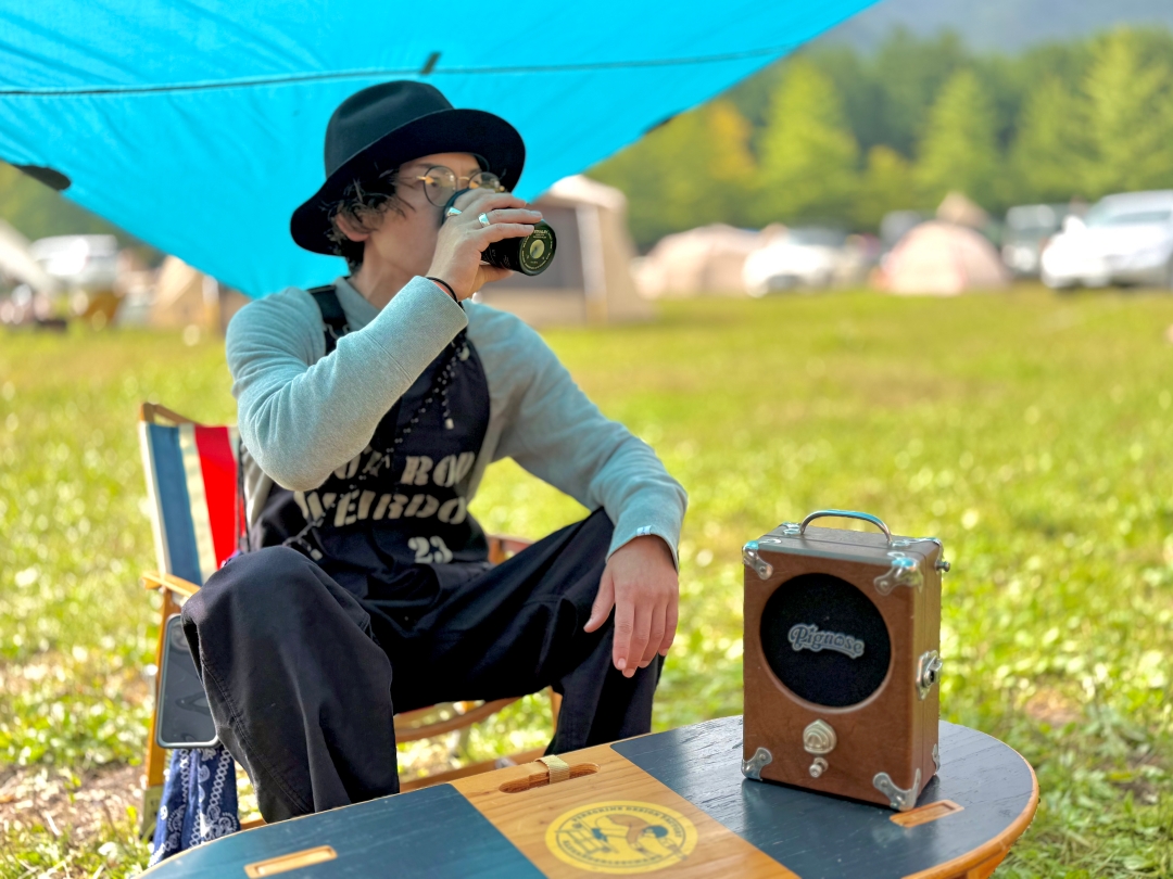 本アイテムのオーナーさんは、このアンプにちょっとしたアイテムをプラスして、キャンプの癒しアイテムに変えていました。
