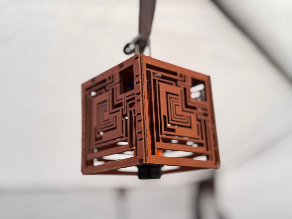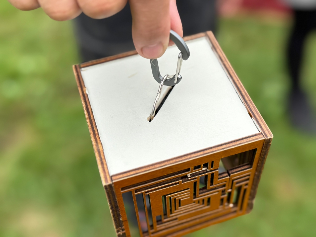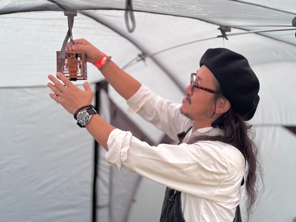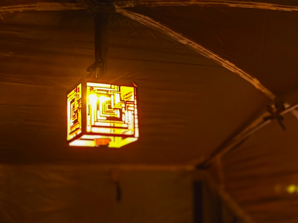 「そのままでは使えなかったので、底面にスリット状の穴を開けて、ゴールゼロのループが通せるよう加工しました。テント内で灯りをつけるとと、この独特のパターンを通した光と影が幕内に広がって、いい雰囲気になりました!」
