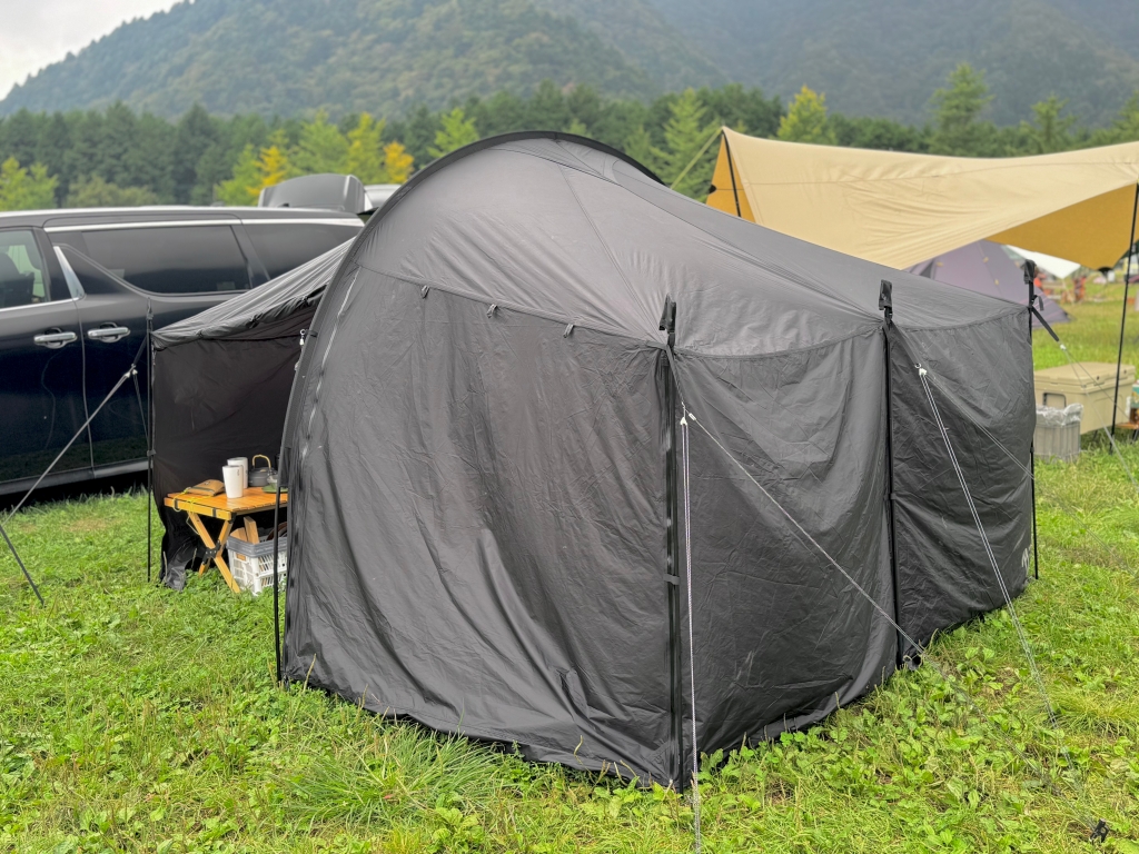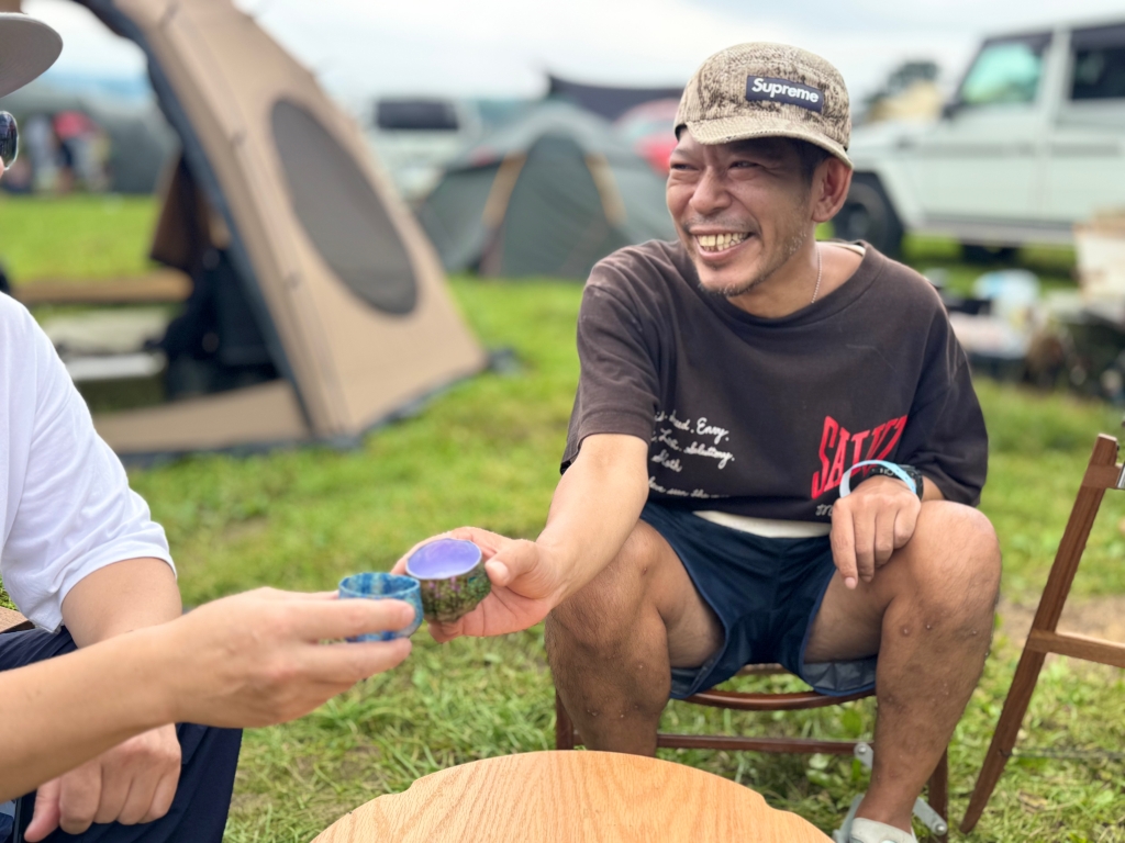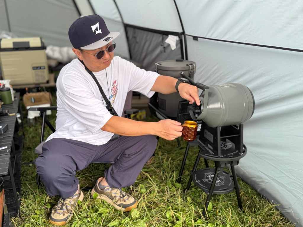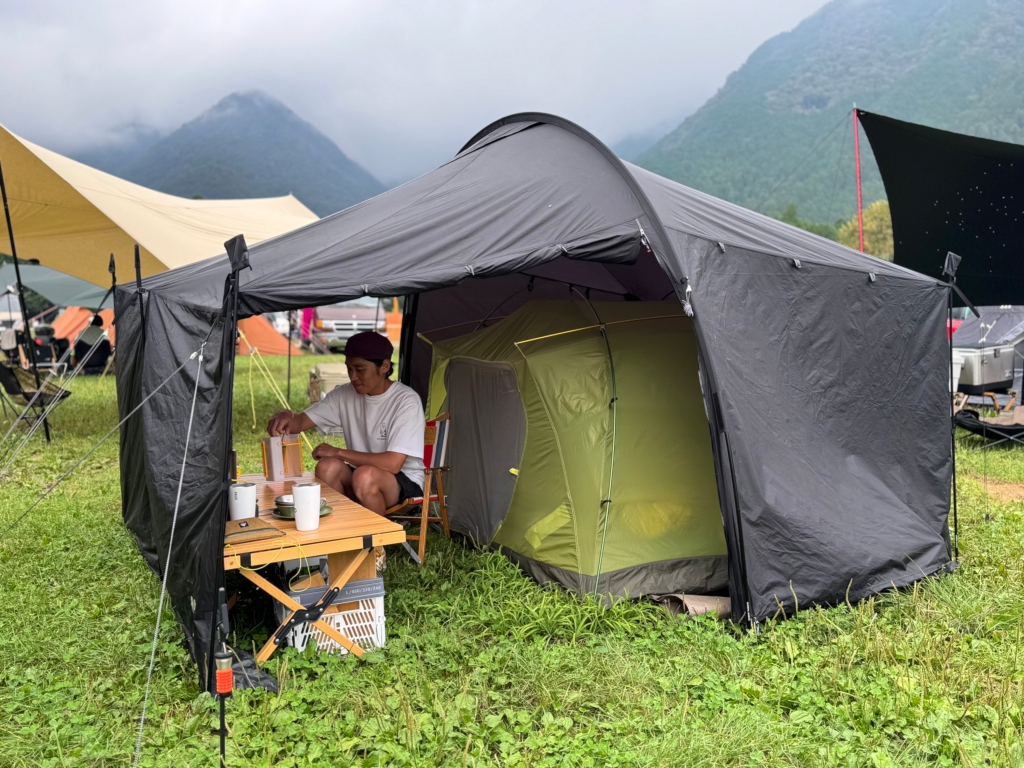 「ジャックシェルターのフロアが四角いので、デッドスペースなくぴったりなのも、気に入っているポイント。今日みたいなキャンプフェスやグループキャンプのときは、このぐらいのサイズ感がちょうどいいですね。」