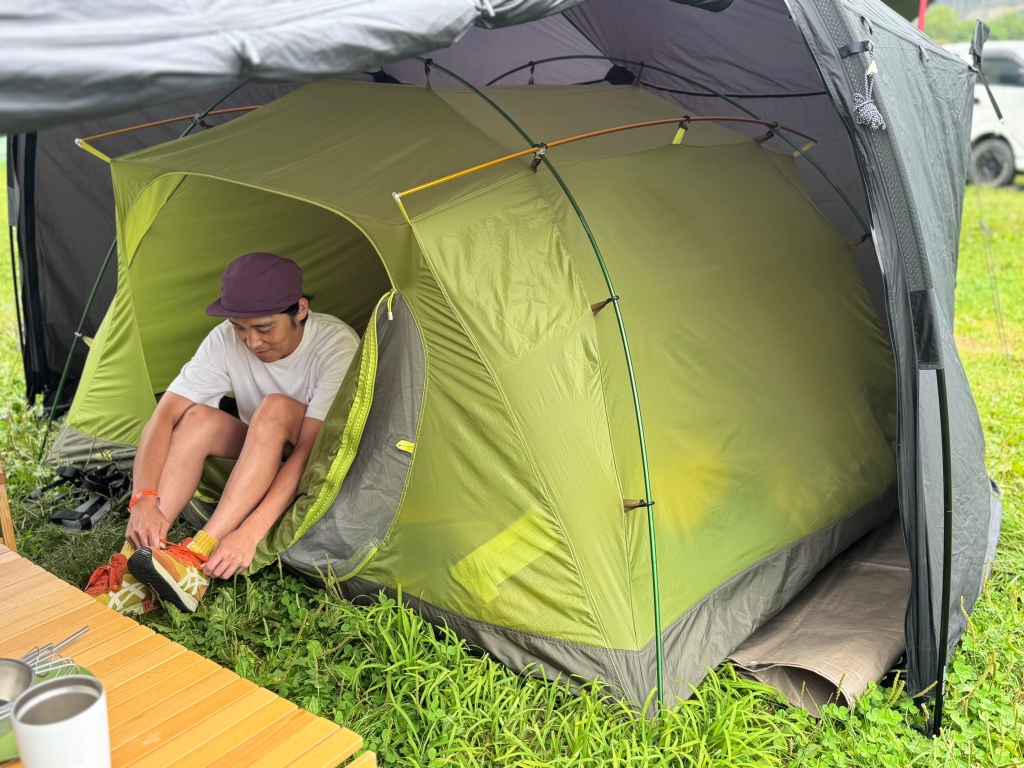「山岳用テント『ミニバス3』は、もともと単体で使っていたんですが、フライシートが加水分解してしまったので、シェルターの寝室として使っています。天井が広くなるようなポール構成になっているので、2人で寝ても圧迫感がなく快適です。」