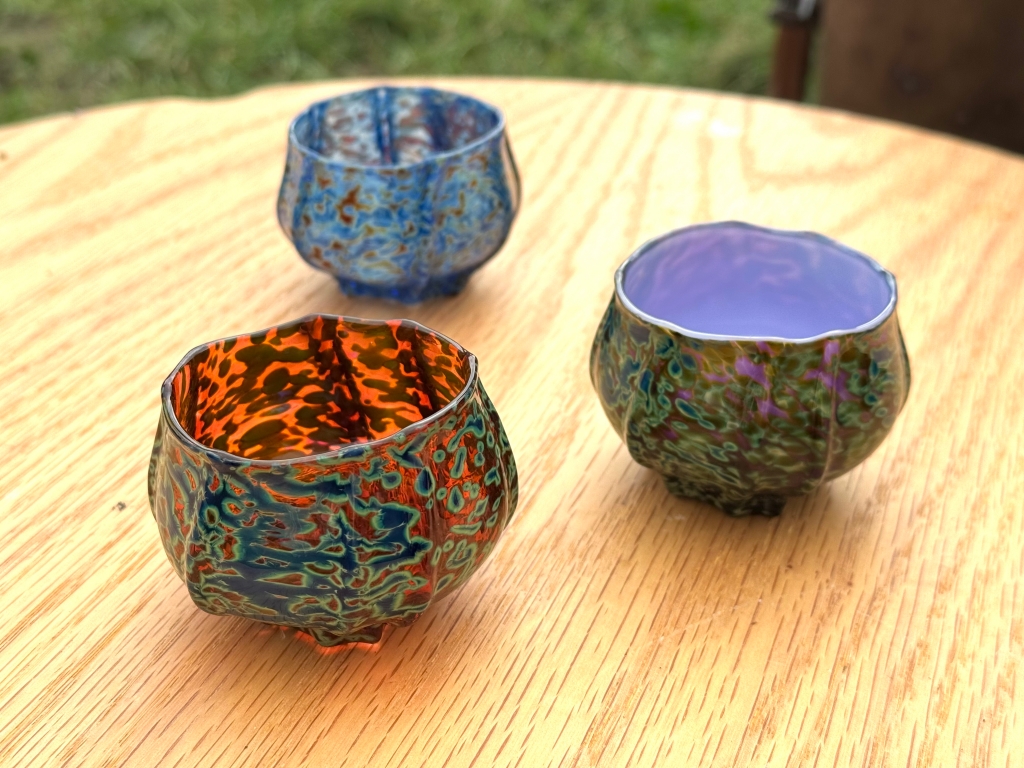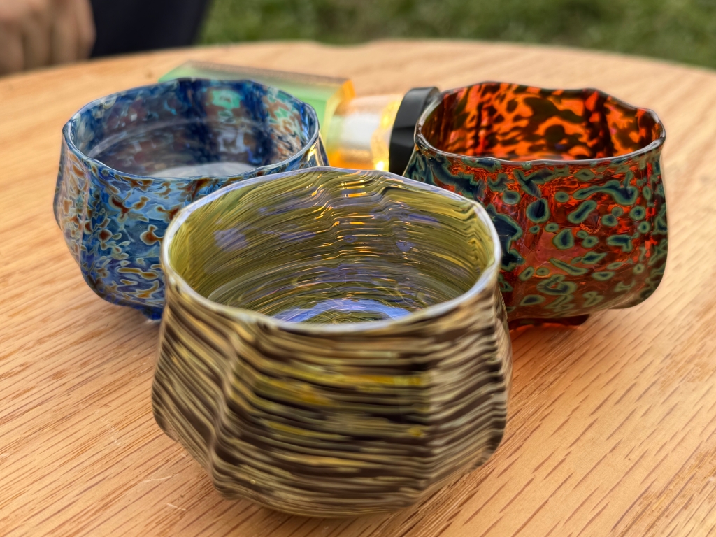 こちらの色鮮やかなガラス製のぐい呑みは、ランタンのホヤを製作している阿蘇の工房、マグマグラススタジオのもの。