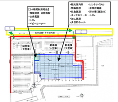 ・施設:駐車場410台、トイレ90器、情報提供・休憩施設、