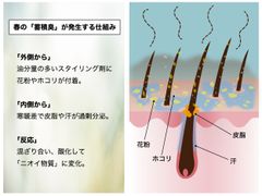 冬の乾燥で水分不足になった頭皮が、防御反応として皮脂を過剰分泌。春の気温上昇で一気ににおいとして表面化。