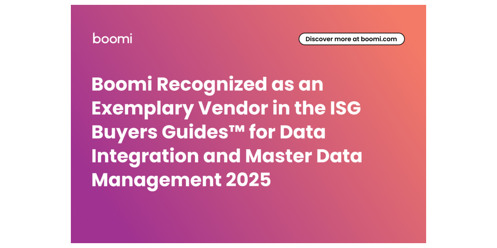 ペンシルベニア州コンショホッケン--(BUSINESS WIRE)--(ビジネスワイヤ) --AIを活用した自動化分野のリーダーであるBoomi™は、ISGソフトウェア リサーチが発行するISGバイヤーズガイド™2025の「データ統合」および「マスターデータ管理」両ガイドにおいて、模範的ベンダーに選出されたことを発表しました。