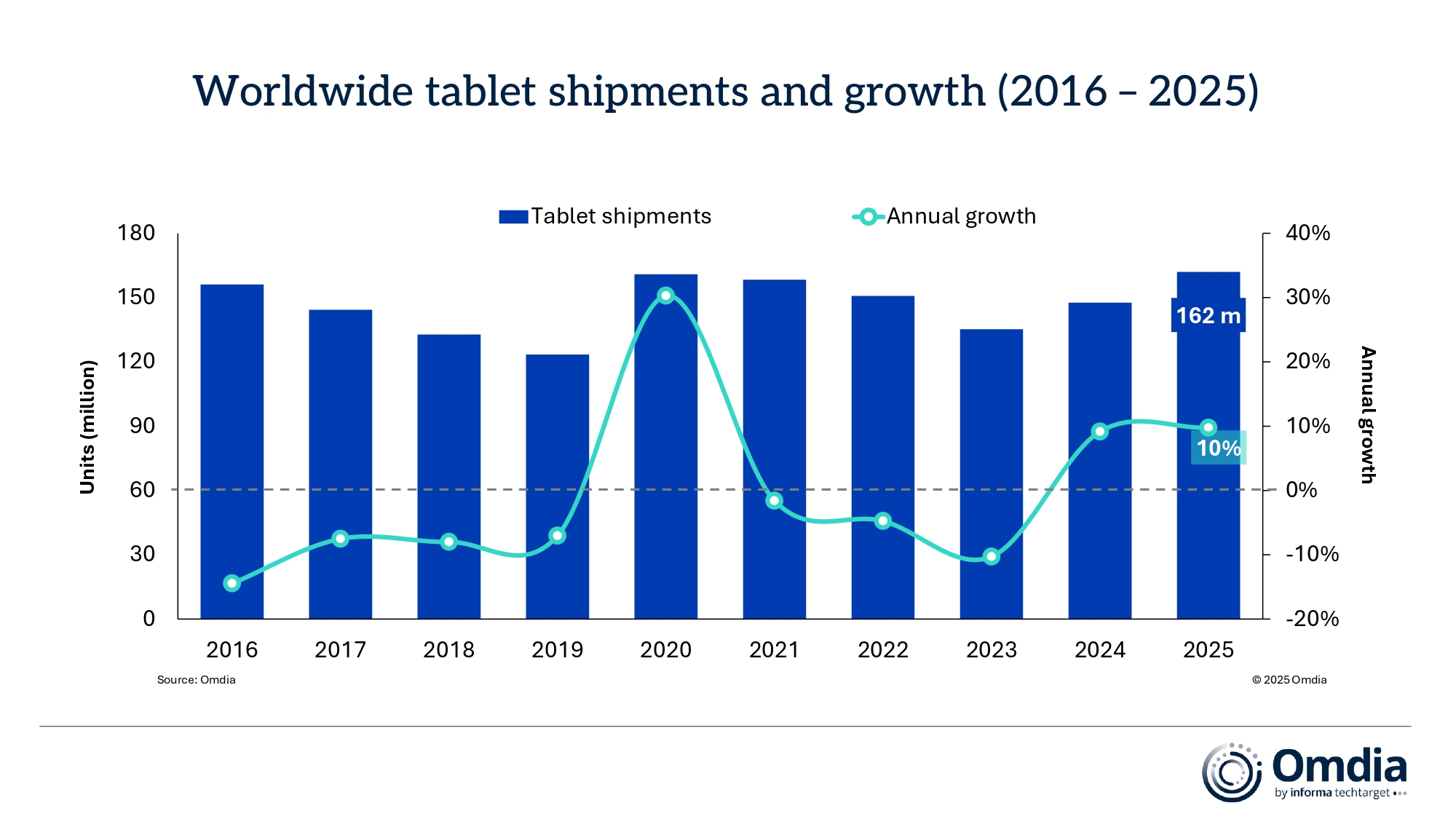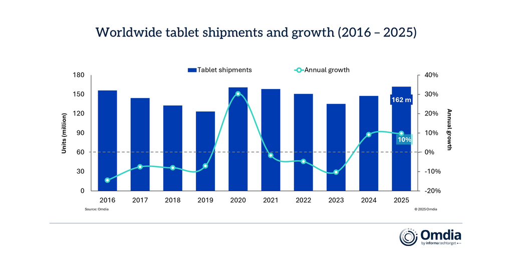 ロンドン--(BUSINESS WIRE)--(ビジネスワイヤ) --オムディアの最新調査によると、世界のタブレット市場は2025年も回復基調が続き、出荷台数は前年比9.8%増の1億6,200万台となりました。勢いが最も強かったのはホリデー四半期で、2025年第4四半期の出荷台数は前年比9.8%増の4,400万台に達しました。