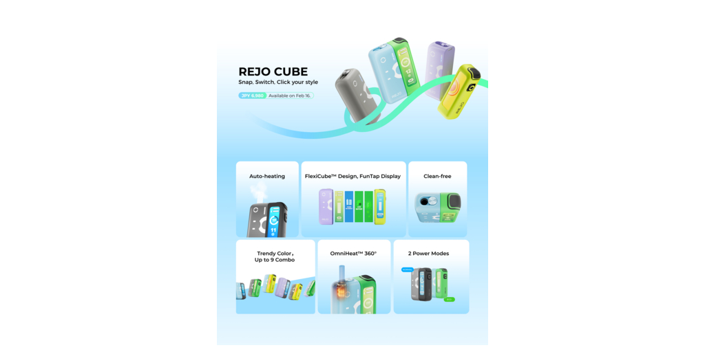 従来のHNBデバイスの設計概念から脱却した「REJO CUBE」は、トレンド志向のデザインとデュアルモード吸引体験を特徴とする新たなデバイスとして、2月16日より日本の主要Eコマース販売チャネルで発売されます。