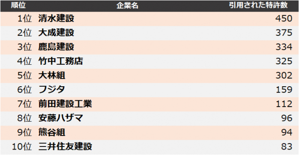 4位 竹中工務店は「容易に追尾対象物の自動追尾が可能な電動走行台車」、5位 大林組は「泥水シールド工法における切羽水圧の制御方法」が、最も引用された特許として挙げられます。