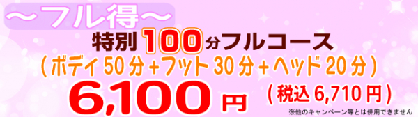 フル得コース!は50分+フット30分+ヘッド20分の計100分が6,100円(税込6,710)と通常のセットメニューには無い特別コースとなります!