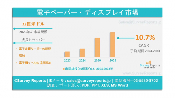 Surveyreportsの専門家は、電子ペーパーディスプレイ市場調査を分析し、2023年に生成された電子ペーパーディスプレイ市場規模が32億米ドルであることを発見しました。さらに、電子ペーパーディスプレイ市場のシェアは、2033年末までに89億米ドルに触れる収益を予見することです。電子ペーパーディスプレイ市場は、2024年と2033年の予測期間中に約10.7%のCAGRで成長することが提案されています。