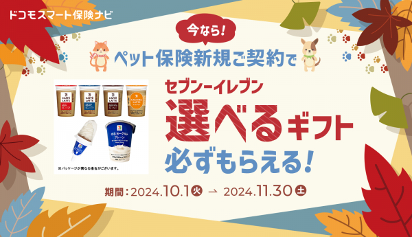 「ドコモスマート保険ナビ」(https://hoken-navi.docomo.ne.jp)を提供する株式会社ドコモ・インシュアランス(本社:東京都中央区 代表取締役社長:吉村忠義)は、2024年10月1日(火曜)からドコモスマート保険ナビで新たにペット保険をご契約いただいたお客さま全員を対象とした『ペット保険で安心!新規のご契約でもれなく「セブンーイレブン 選べるギフト」プレゼントキャンペーン』を開始しました。