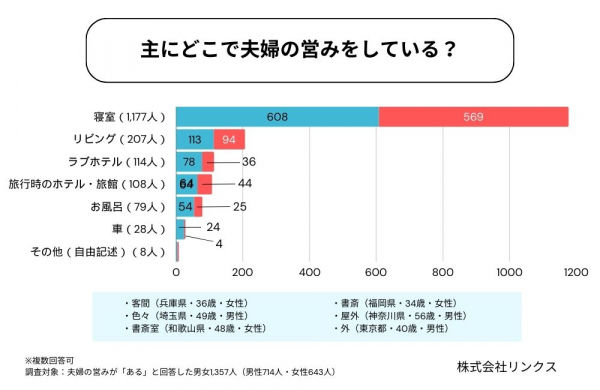 場所は圧倒的に「寝室」。次いで「リビング」「お風呂」。自宅外では「ラブホテル」「旅行先」「車」も少数派ながら存在。