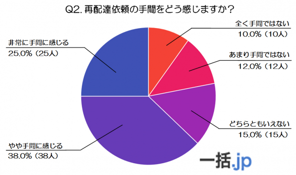 最も多かったのは「やや手間に感じる」と答えた人で、全体の38.0%(38人)を占めています。これに「非常に手間に感じる」25.0%(25人)を合わせると、6割以上が再配達依頼を負担に感じていることがわかります。