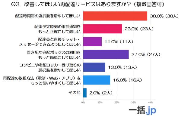 改善点として最も多かったのは「配達時間帯の選択肢を増やしてほしい」で、生活リズムに合った受け取りを可能にするニーズが際立っています。さらに「宅配ボックスや置き配の利便性向上」「事前通知の精度改善」など具体的な利便性強化を求める声も目立ちました。