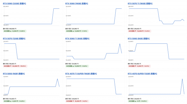 - RTX 5070 Ti (16GB): ▼ -5.6% - ハイエンドクラスではRTX5090、RTX5080が値上がりする中でRTX5070Tiは下落傾向。ボーナス商戦を前に調整進む。